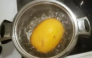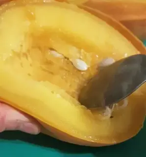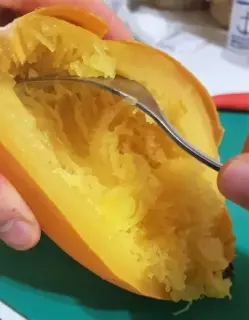 La courge spaghetti doit son nom au fait que sa chair se défait en longs filaments une fois cuite.