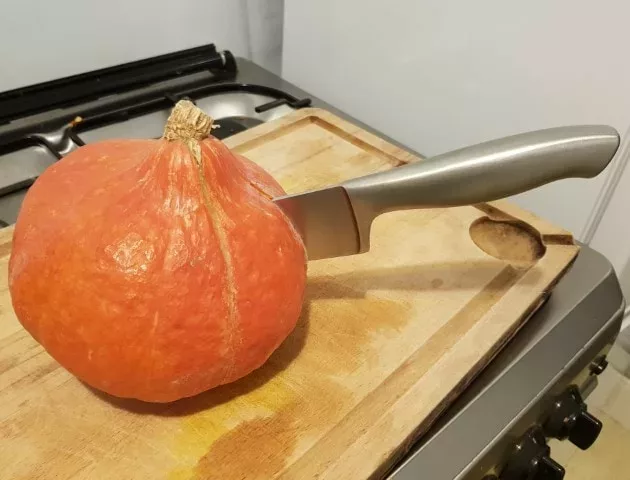 - 2Pour couper le potimarron, soyez très prudent(e), comme avec toutes les cucurbitacées... Plantez d'abord votre couteau vers le milieu, puis une fois que vous l'avez bien enfoncé, tranchez vers le bas. Il ne vous reste plus qu'à le tourner et répéter l'opération pour le trancher en deux.