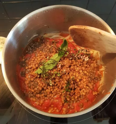Et si vous trouvez les lentilles un peu tristounettes, vous allez voir que l’association avec la tomate et l’oignon leur apporte couleur et saveur.