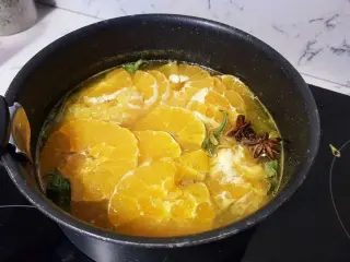 - 4Puis rajoutez les épices, la verveine (gardez quelques feuilles pour l'assemblage final) et les tranches d'oranges. Laissez refroidir et infuser 2 heures.