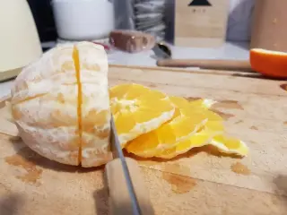 - 1Pelez la moitié des oranges à vif et coupez-les en rondelles de quelques millimètres d'épaisseur, réservez.