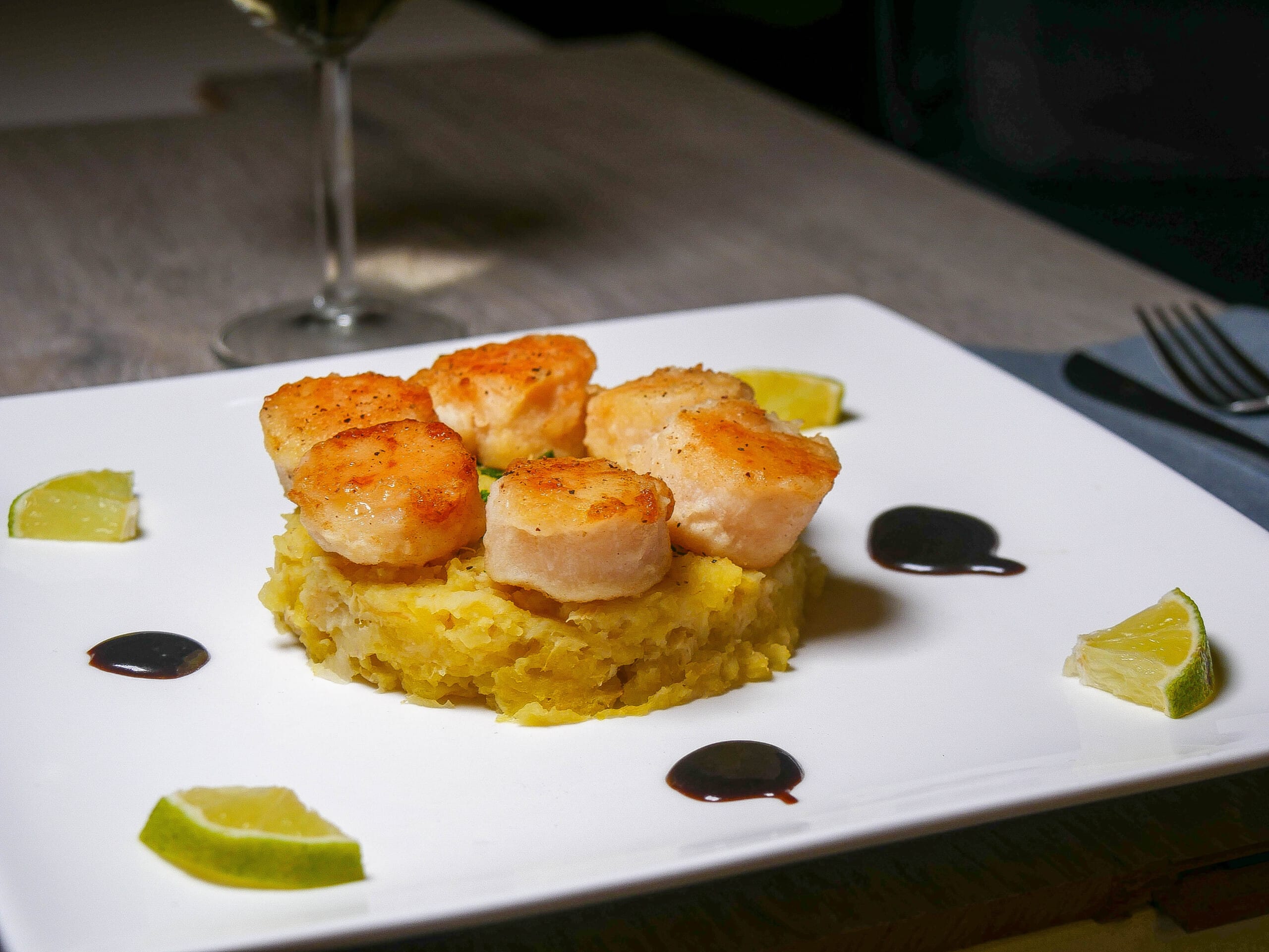 Au niveau de la préparation, on vient « snacker » les noix de Saint-Jacques dans un peu de beurre. On les dispose ensuite sur un lit d’écrasée pommes de terre/céleri-rave à l’huile d’olive et parfumée au thym. Et pour le dressage, on sert le tout avec un caramel balsamique qui va rendre accroc tous vos convives😋