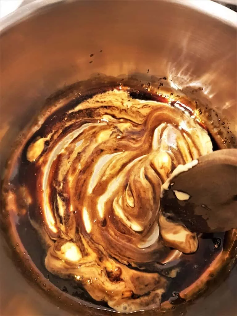 Les noix de Saint-Jacques sont ici simplement « snackées » dans un peu de beurre, et présentées telles-quelles avec la sauce balsamique caramélisée.