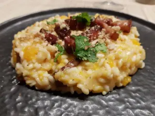 Le lard grillé et les noix rendent ce risotto croustillant et gourmand, tandis que la courge butternut lui apporte légèreté et finesse.
