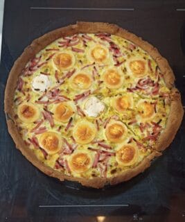 Mais en lisant la recette, je pense que l’étape « Versez la garniture, et parsemez de fromage de chèvre coupé en rondelles. » devrait être l’avant-dernière étape (et non pas la 3)😉.