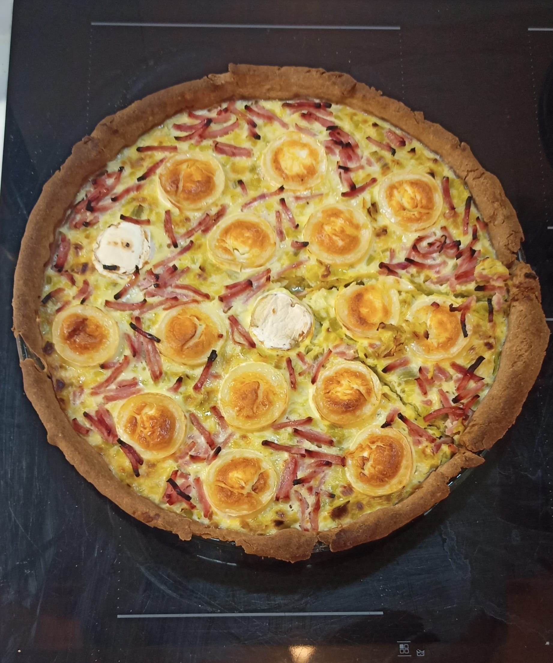 Voilà, j’ai fait cette tarte, qui est en effet très bonne ! (avec une pâte à la farine complète, et j’y ai ajouté des allumettes de jambon)