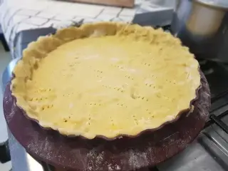 Comme vous le verrez, il s’agit de réaliser une base de pâte sablée, que l’on fait précuire. On la recouvre ensuite d’une crème pâtissière à la pistache et on vient enfin y poser des moitiés de poires pochées.
